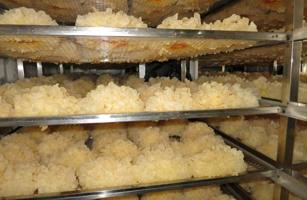 1、  烘房預(yù)熱至40—45℃,將已整修、冼凈的銀耳送入烘房;